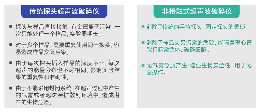 非接觸式超聲破碎儀是在傳統(tǒng)超聲波處理基礎上的技術革新,通過球面固態(tài)超聲換能器將聲波以三維方式聚焦到樣本區(qū)域,聚焦聲波能夠以不同角度的能量輸入獲得良好的處理效果,避免傳統(tǒng)超聲能量的不聚集可能引起的樣本處理過度及熱損傷。
